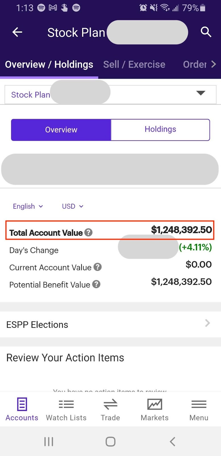 They say “pics or it didn’t happen,” so here’s a (redacted) picture of my stock holdings that I gave up back when the price was less than 25% of its current value (roughly late 2021):